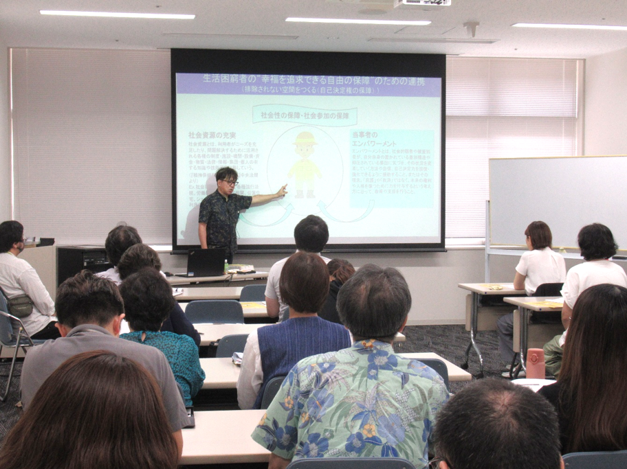 沖縄県労働金庫様の「<ろうきん>働く人と子どもの明日を応援プロジェクト」の支援を受け、2025年7月31日、当協会主催による「債務整理と生活保護制度に関する支援者向けセミナー」を開催しました。現地(グッジョブセンターおきなわ研修室)とオンライン(Zoom)のハイブリッド形式で行い、生活困窮者支援に携わる関係機関から計50名の方にご参加いただきました。