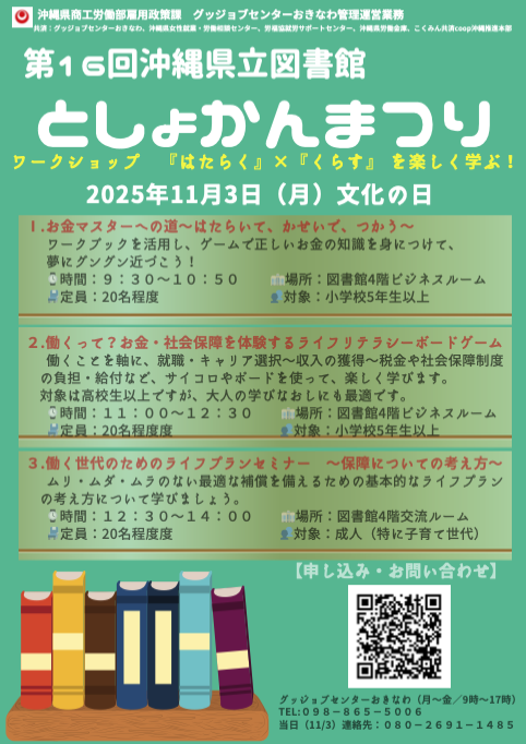 沖縄県立図書館で開催される「第16回 としょかんまつり」(2025年11月3日・文化の日)において、グッジョブセンターおきなわ/沖縄県労働金庫/こくみん共済coop沖縄推進本部/沖縄県女性就業・労働相談センター/労福協就労サポートセンターの共催で、「はたらく×くらすを楽しく学ぶ!-社会保障制度とお金と生活の力を身につけて、安心の未来をつくろう-」と題した体験型イベントを企画・実施します。