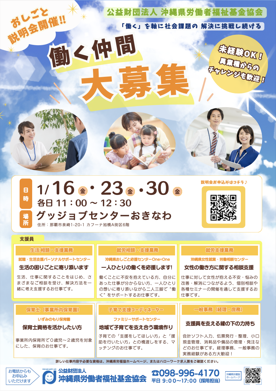 沖縄県労福協では、「誰かの役に立ちたい」「これまでのスキルや資格を活かしたい」「協働して仕事に取り組みたい」という思いをもつ仲間を大募集しています!生活相談員・就労支援員や、支援員、子育て支援アドバイザー等福祉に関する複数の職種をご用意しており、資格や経験を活かして働きたい方から、福祉に興味関心がある未経験の方まで、ご応募できるようになっています。沖縄県労福協とは?というお話や、実際の業務がどのような内容なのか、働いている職員の声も交えながらお伝えできるように、会社説明会を開催いたします。ぜひ、お気軽にご参加ください。